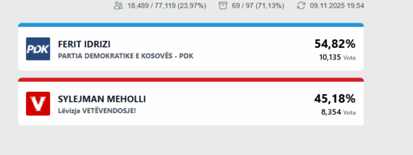 Atje janë numëruar rreth 72 përqind e votave dhe i pari ka dal kryetari aktual Ferit idrizi me 54% përderisa ai i VV me 45 për qind.