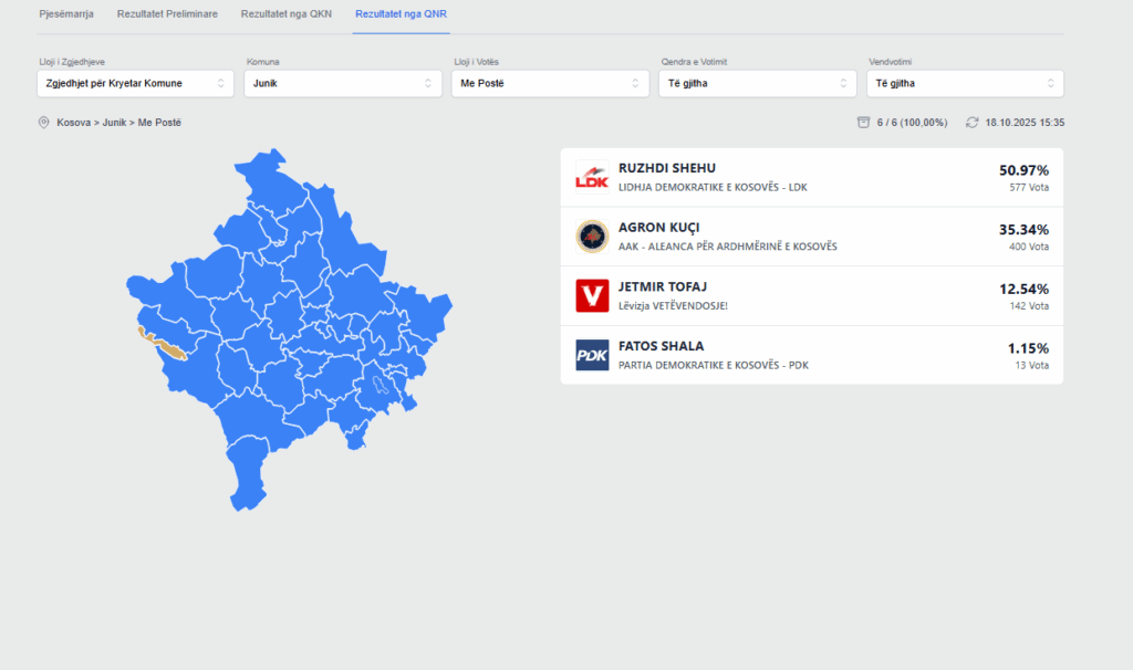 Ruzhdi Shehu i Lidhjes Demokratike të Kosovës, prin me 50.97% ose 577 Vota