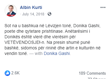 “Sot na u bashkua në Lëvizjen tonë, Donika Gashi, poete dhe qytetare prishtinase.” – kishte shkruar ai vitin e kaluar.