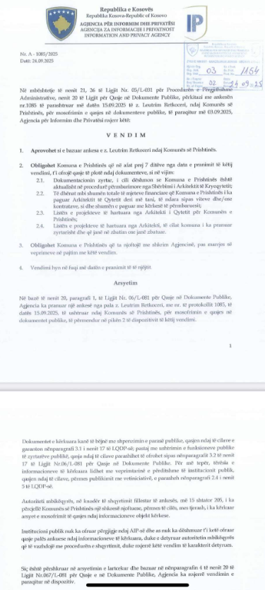 Në vendimin e datës 24 shtator 2025, AIP obligon Komunën e Prishtinës që brenda 7 ditëve nga pranimi i vendimit t’i ofrojë palës ankuese qasje në këto dokumente: