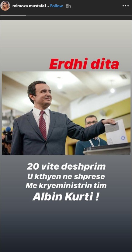 Këngëtarja e ka publikuar një foto të Albinit pranë të cilës e ka quajtur kryeministër dhe i ka shkruar edhe disa fjalë.