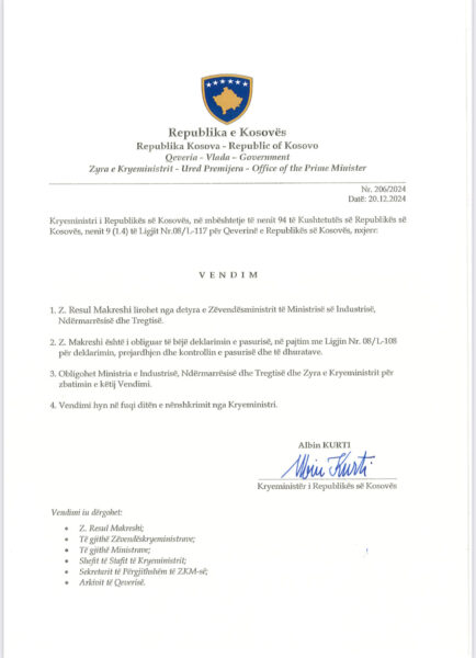 “Partia Demokratike e Ashkanlive të Kosovës, njofton opinionin publik, se dje Kryeministri z.Kurti, ka liruar nga detyra zëvendësministrin e Industrisë, Ndërmarrësisë dhe Tregtisë z.Resul Makreshi, duke e zëvendësuar atë me z.Agim Hyseni. I nderuari z.Makreshi, me profesionalizëm dhe përgaditje adekuate për politikat qeveritare, me kujdesë të plotë kontribuoj gjatë këtij mandati qeverisës, ku shërbeu me integritet të lartë duke mos i shkaktuar qeverisë dhe pozitës së tij asnjë dëm dhe skandal të vetëm. Fakti që, z.Agim Hyseni, tashmë zëvendësminister, ishte i denuar dhe i burgosur për keqpërdorim fondesh, PDAK, shpreh shqetësimin e saj për vendimin e Kryeministrit Kurti, në emrimin e z.Agim Hyseni në postin e zevendësministrit të MINT, të cilin e konsiderojmë të ndikuar politikisht nga ish deputeti dhe ish i burgosuri për korrupsion gjithashtu Etem Arifi, kryetar i PAI-së dhe deputeti aktual Bekim Arifi.”