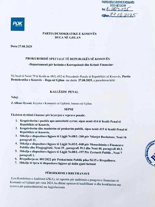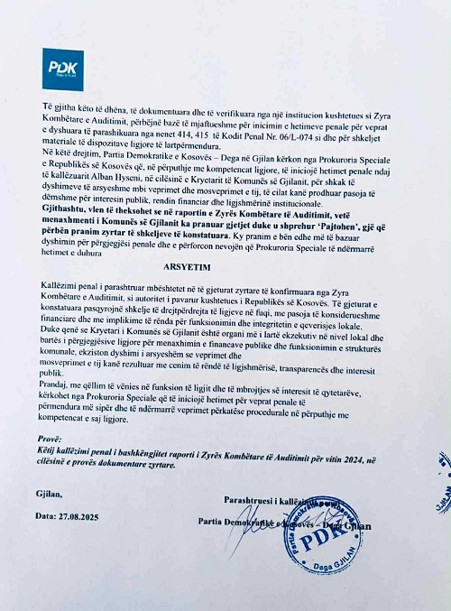 Dega e PDK-së në Gjilan ka dorëzuar një kallëzim penal ndaj kryetarit të Komunës, Alban Hyseni, duke kërkuar që Prokuroria Speciale të nisë hetime për keqpërdorim të detyrës dhe keqmenaxhim të financave publike.