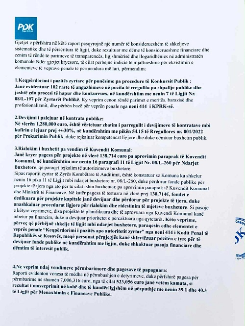 Sipas PDK-së, raporti i Zyrës Kombëtare të Auditimit për vitin 2024 ka evidentuar shkelje të ligjit, të cilat vetë menaxhmenti komunal i ka pranuar si të sakta, duke u shprehur se “pajtohet” me gjetjet.