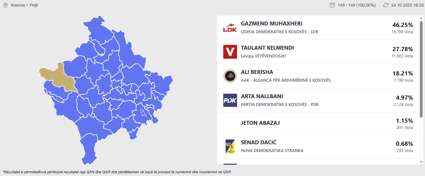 Nga të dhënat e KQZ-së, Gazmend Muhaxheri në zgjedhjet lokale ka marr 46.25% ndërsa Taulent Kelmendi 27.78%.