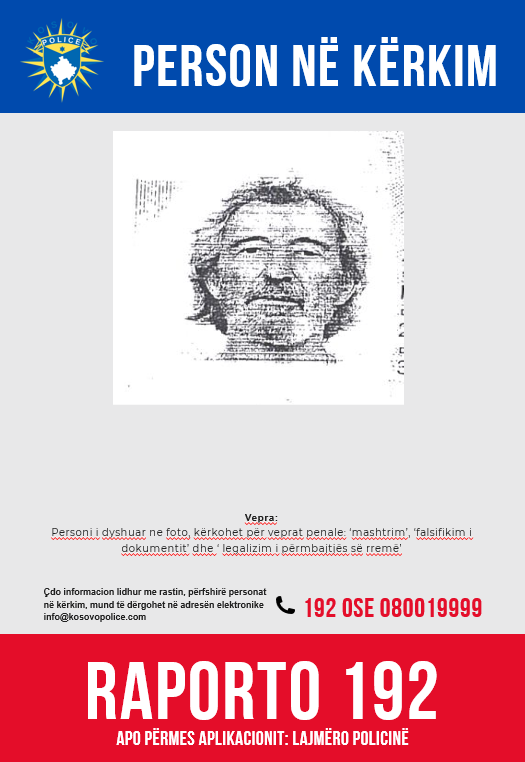 “Policia e Kosovës kërkon nga qytetarët e Republikës së Kosovës që kushdo që ka informacion për vendndodhjen e personit të dyshuar në foton e bashkangjitur, të lajmërojë Policinë e Kosovës apo të lajmërohet në stacionin më të afërt policor” thuhet në njoftimin e policisë.