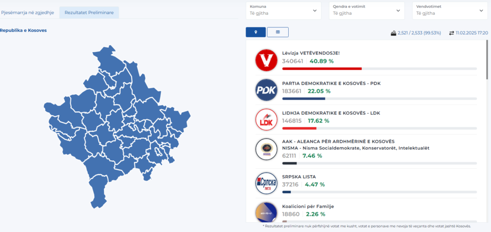 KQZ ka përditësuar sërish të dhënat për rezultatet preliminare pas procesimit të 99.53 për qind të vendvotimeve.