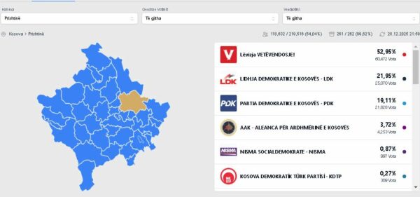 Lëvizja Vetëvendosje ka fituar bindshëm duke marrë mbi 52% të votavë në kryeqytet.