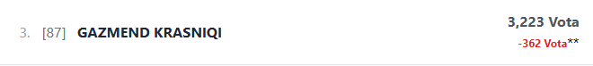 Në vendin e parë është kandidati, Gazmend Krasniqi, të cilit janë hequr 362 vota.