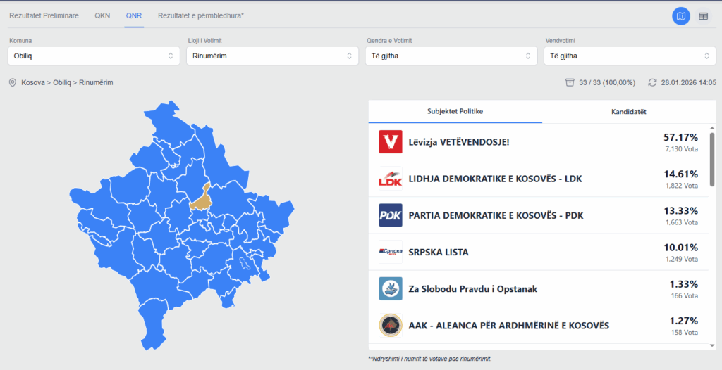 Sipas Komisionit Qendror të Zgjedhjeve (KQZ) në Qendrën Komunale të Numërimit (QKN), në Obiliq ka përfunduar procesi i rinumërimit, raporton Periskopi.