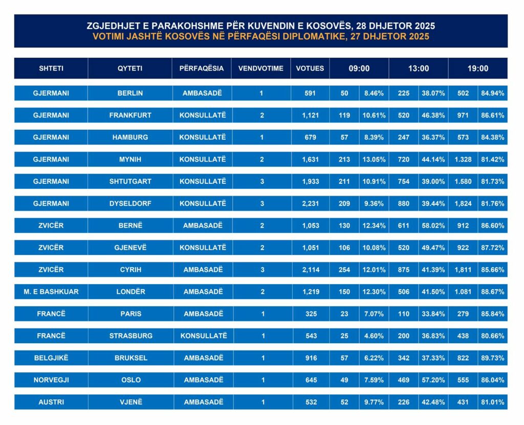 “Ju njoftojmë se deri në këtë kohë ka përfunduar votimi në 25 përfaqësitë diplomatike në shtetet, si: Turqi, Gjermani, Zvicër, Francë, Belgjikë, Norvegji, Austri, Suedi, Slloveni, Danimarkë, Itali, Kroaci, Holandë, Republikë Çeke, Hungari dhe në Mbretërinë e Bashkuar. Sipas kohës lokale në Kosovë, në orën 01:00 pas mesnatës, do të përfundojë votimi në 4 përfaqësitë tjera, në Shtetet e Bashkuara të Amerikës dhe Kanada. Gjatë gjithë ditës së sotme, KQZ ka qenë në kontakt të vazhdueshëm me përfaqësitë diplomatike dhe nga zyrtarët e shërbimit votues u janë ofruar udhëzimet e nevojshme për zhvillimin e votimit sipas ligjit dhe procedurave”