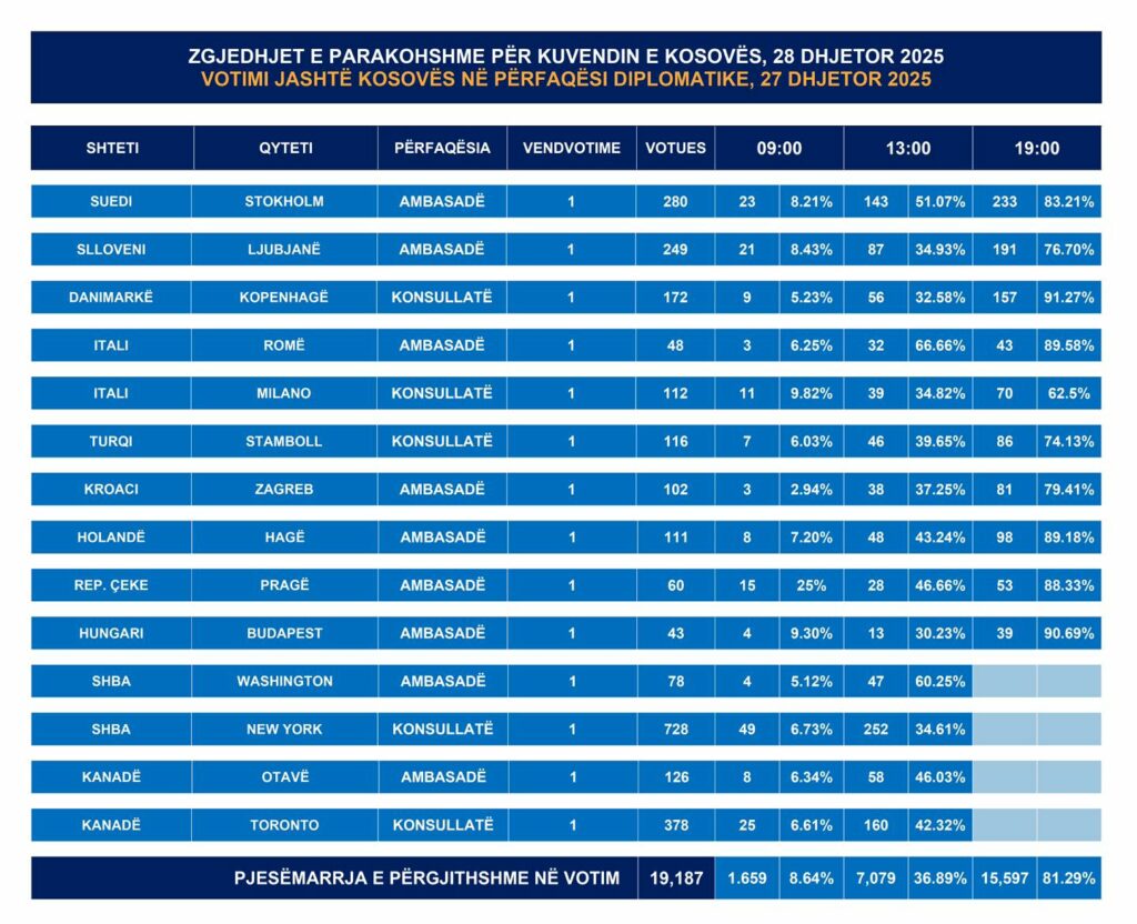 Nga 19,187 votues të regjistruar në përfaqësitë diplomatike, kanë votuar 15,597 votues apo 81.29 për qind./Periskopi