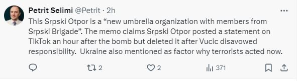 Ky Srpski Otpor është një ‘organizatë e re ombrellë me anëtarë nga Brigada Srpski’. Memorandumi pretendon se Srpski Otpor postoi një deklaratë në TikTok një orë pas bombës, por e fshiu pasi Vuçiç hodhi poshtë përgjegjësinë. Ukraina përmendi gjithashtu si faktor pse terroristët vepruan tani”, ka shkruar Selimi.