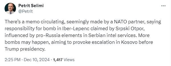 Po qarkullon një memorandum, me sa duket i bërë nga një partner i NATO-s, ku thuhet se përgjegjësia për bombën në Iber-Lepenc është marrë nga Srpski Otpor, i ndikuar nga elementë pro-rusë në shërbimet inteligjente serbe. Mund të ndodhin më shumë bomba, që synojnë të provokojnë përshkallëzim në Kosovë para presidencës së Trump”, ka shkruar Selimi.