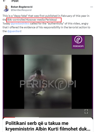 Politikani serb, Boban Bogdanoviq, nëpërmjet një cicërime në rrjetin social ‘X’, më 30 shtator 2023, ka shkruar se ‘mediumi kosovar Periskopi kontrollohet nga BIA serbe’.