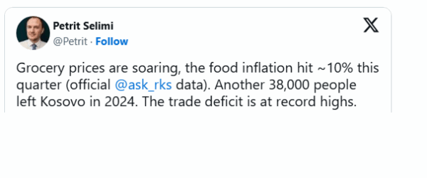 Selimi ka shkruar se inflacioni i çmimit të gjërave ushqimore ka shkuar mbi 10% dhe se vetëm në vitin 2024 janë larguar nga vendi 38 mijë persona.