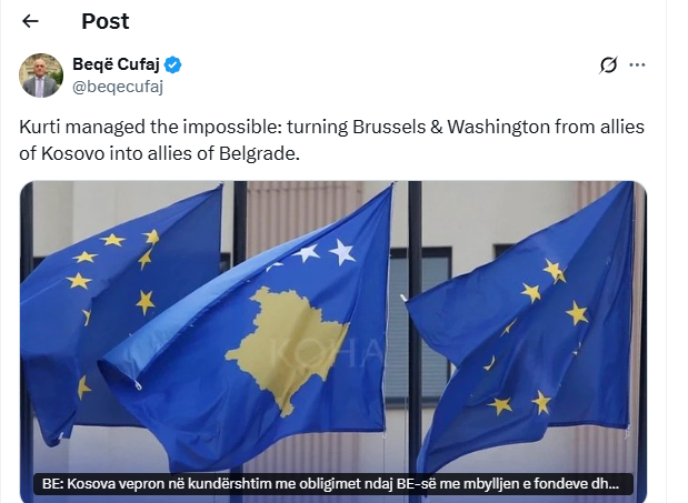 “Kurti ia doli të pamundurës: t’i shndërrojë Brukselin dhe Uashingtonin nga aleatë të Kosovës në aleatë të Beogradit”, ka shkruar Cufaj.