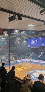 Pas përfundimit të pjesës së parë të ndeshjes finale të Superkupës së Kosovës në basketboll – eskaloi situata mes tifozërive të pranishme në sallë.