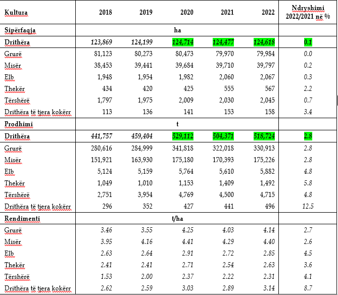 “Sa i përket sipërfaqeve të mbjella me drithëra në gjithë territorin e Kosovës, në bazë të të dhënave zyrtare të dërguara nga Agjencia për Zhvillimin e Bujqësisë, në vitin 2021 ishin gjithsej 68.728 hektarë. Kjo sipërfaqe e këtyre të mbjellave në vitin 2022 ishte 91.436 hektarë, pra më një rritje prej 22,708 hektarë apo 33.04 për qind më shumë se në vitin 2021. Në vitin 2023, sipërfaqet e mbjella me drithëra ishin 112, 206 hektarë apo 20,770 hektarë më shumë se në vitin 2022, që shprehur në përqindje i bie 22.72 për qind më shumë. Në bazë të këtyre të dhënave zyrtare, të mbjellat me drithëra nga viti 2021 e deri në vitin 2023 kanë shënuar rritje për 43,478 hektarë më shumë apo 63.26 për qind më shumë”, thuhet në përgjigjen e MBPZHR-së.