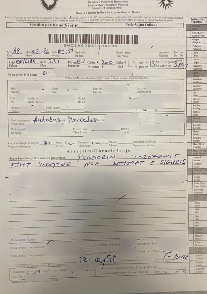 Pas verifikimit, është konstatuar se kjo është hera e dytë që shoferi shkel rregullat, ndaj i është sekuestruar patentë-shoferi dhe i është shqiptuar masa e ndalimit të drejtimit të mjetit motorik për një periudhë prej tre muajsh.