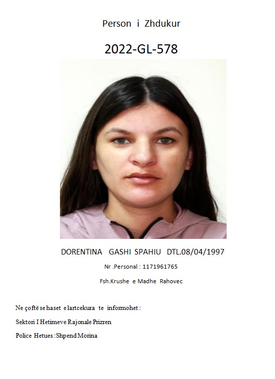 Me date 26 Nëntor 2022,rreth orës 12:00, si rezultat i përpjekjeve te pandërprera te hetueseve policor ,pas ndërmarrjes se veprimeve te duhura hetimore dhe pas publikimit te fotografisë ne rrjetet sociale, është arrite qe te kontaktohet viktima e rastit Dorentina ( Vllaznim ) Gashi – Spahiu ,dtl.08.04.1997 e cila ka qene e raportuar nga familjaret e saje si “Person i Zhdukur “ qe nga data 09.11.2022.