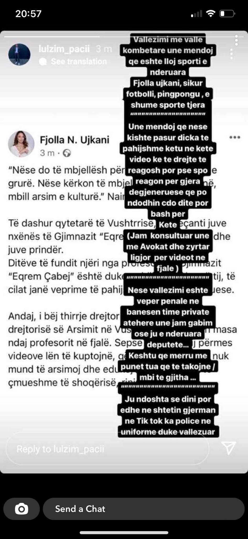 “Të dashur qytetarë të Vushtrrisë, në veçanti juve nxënës të Gjimnazit “Eqrem Çabej”- Vushtrri, dhe juve prindër. Ditëve të fundit njëri nga profesorët e Gjimnazit “Eqrem Çabej” është duke publikuar video të tij, të cilat janë veprime të pahijshme dhe degjeneruese” ka shkruar deputetja Ujkani.