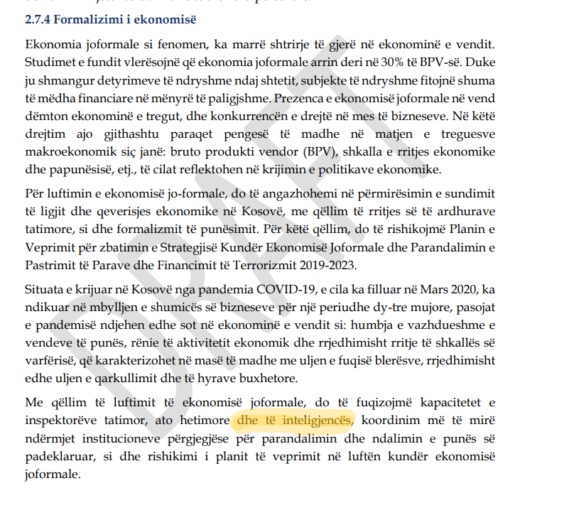 Në një prej pjesëve më konkrete të programit është lufta kundër ekonomisë informale. Ajo që bie në sy është mungesa e plotë e senistivitetit duke qenë se një pjesë e madhe e qytetarëve që bëjnë biznes në ekonomi informale i takojnë shtresës së varfër të shoqërisë dhe përmes punës së tyre thjesht nxjerrin bukën e gojës.