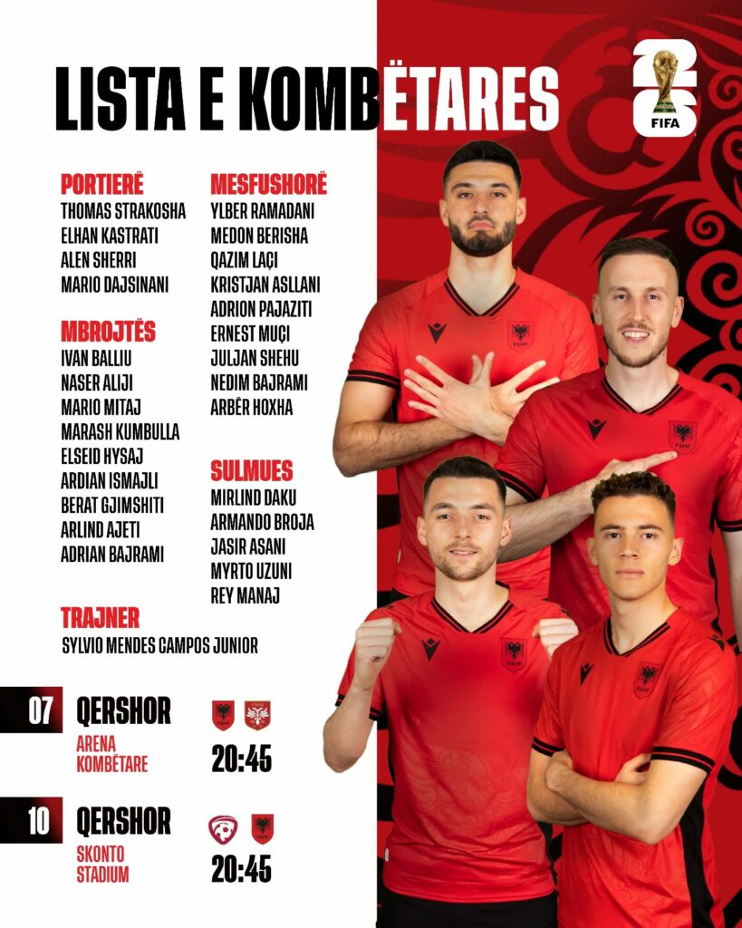 Trajneri Silvinjo ka përzgjedhur 27 futbollistë për ndeshjet kualifikuese të Botërorit 2026 kundër Serbisë dhe Letonisë.
