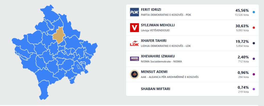 Ferit Idrizi i Partisë Demokratike të Kosovës ka marrë 13,526 vota apo 45,56 për qind të tyre.
