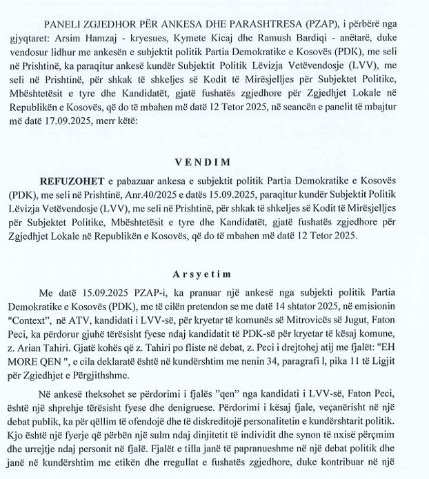 Paneli Zgjedhor për Ankesa dhe Parashtresa ka refuzuar si të pabazuar ankesën e PDK-së ndaj Lëvizjes Vetëvendosje, e cila kishte pretenduar se kandidati i Lëvizjes Vetëvendosje për kryetar të Komunës së Mitrovicës së Jugut, Faton Peci, e kishte fyer kundërshtarin e tij nga PDK, Arian Tahiri, duke i thënë “qen” gjatë një debati televiziv.