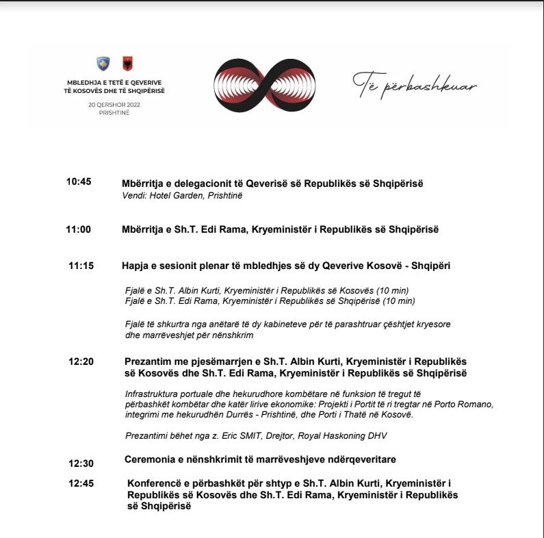 Pritja dhe mbledhja do të mbahen në një hotel në kryeqytet. Delegacioni i Qeverisë së Shqipërisë pritet të mbërrijë aty në orën 10:45 dhe në orën 11:00 është planifikuar pritja e kryeministrit të Shqipërisë, Edi Rama nga kryeministri i Kosovës, Albin Kurti.