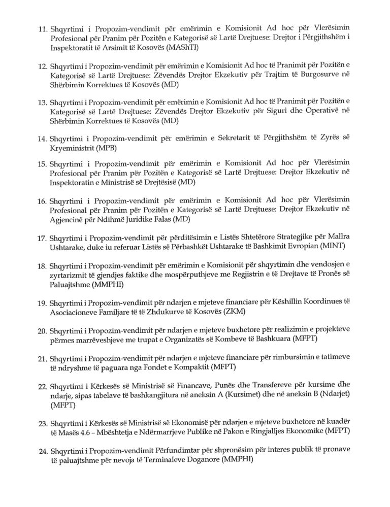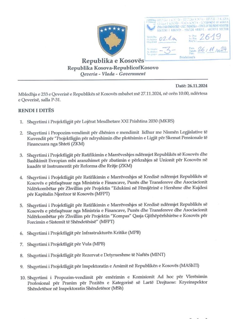 Ndër pikat më të rëndësishme do të jenë Ligjin për Skemat Pensionale të Financuara nga shteti.