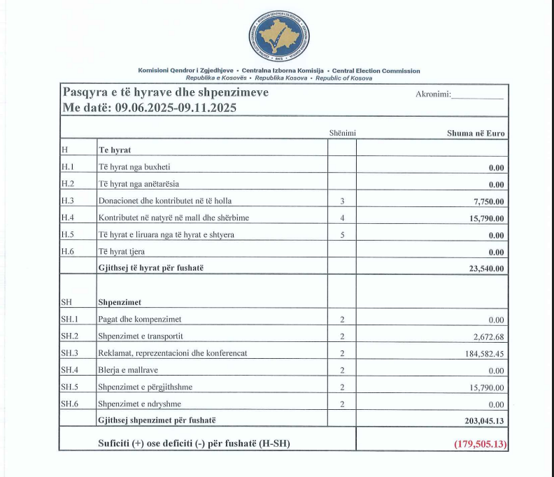 Lidhja Demokratike e Kosovës ka raportuar shpenzime për këtë fushatë 203 mijë euro, derisa të hyra vetëm 23 mijë e 540 euro.