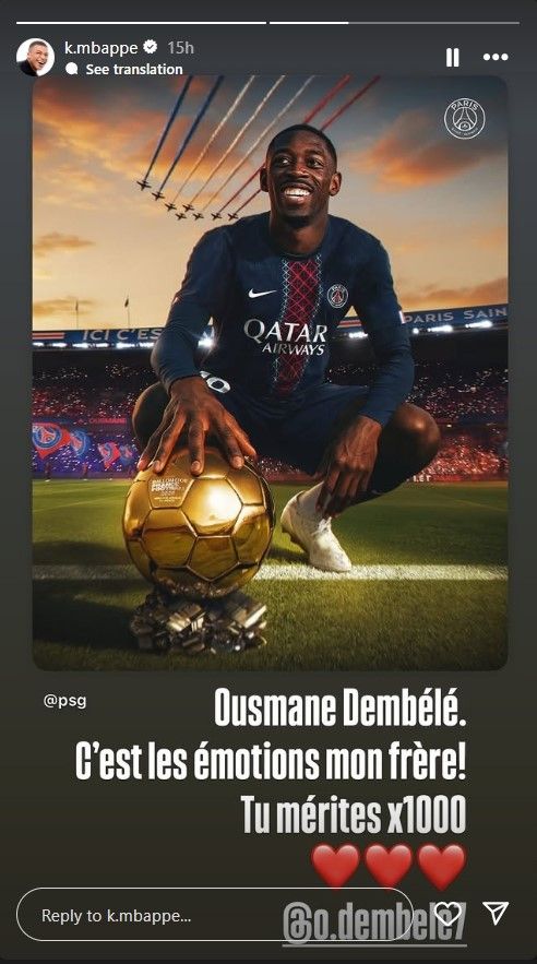 “Ousmane Dembele. Ka të bëjë me emocionet, vëlla. E merituar 100 herë”, shkroi ylli francez i Real Madridit në Instagramin e tij.