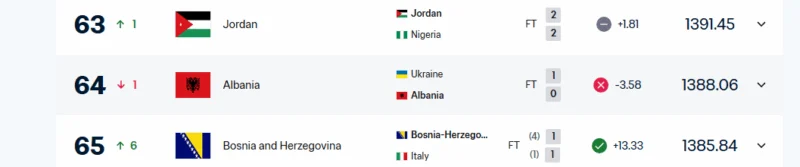 Kështu kombëtarja shqiptare që zhgënjeu në miqësoren me Ukrainën ra edhe një pozicion në renditje dhe tani e sheh veten në vendin e 64 me 1388.06 pikë, 3.58 pikë më parë se në renditjen e javës së kaluar.