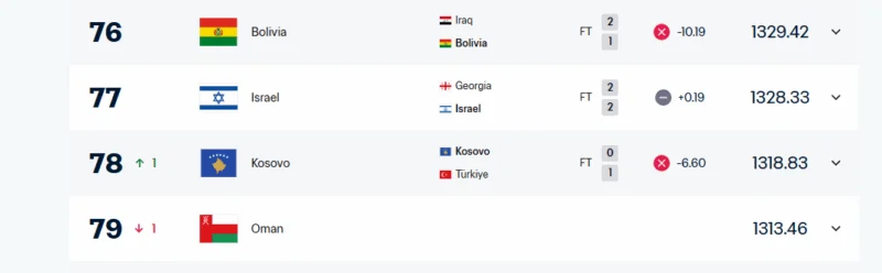 Ndryshe ndodhi me Kosovën që fitoi një pozicion duke u ngjitur në vendin e 78 pavarësisht humbjes së dhimbshme me Turqinë në finalen e playoffit. Skuadra dardane shkon në kuotën e 1318.83 pikë, 6.60 pikë më pak në krahasim me klasifikimin paraardhës.