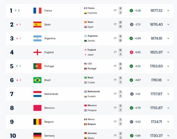 Ndryshime ka edhe në krye të klasifikimit, pasi tani në vendin e parë është ngjitur Franca që fitoi në miqësoren me Kolumbinë 3-1 duke zbritur në vendin e dytë Spanjën që nuk shkoi më shumë se barazimi 0-0 me Egjiptin.
