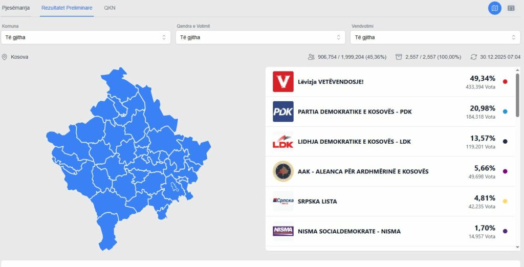 Bazuar në këto rezultate, Lëvizja Vetëvendosje është fituese e zgjedhjeve të 28 dhjetorit, duke rrëmbyer 433 mijë e 394 vota, transmeton Periskopi.