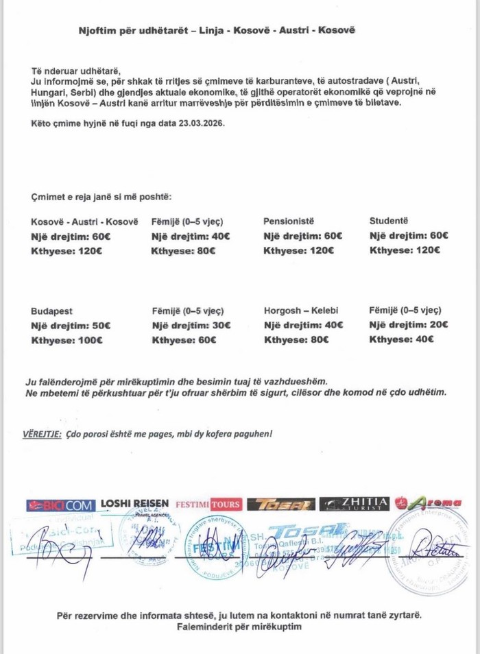 Çmimet e reja do të hyjnë në fuqi nga data 23 mars 2026 dhe do të aplikohen nga të gjithë operatorët që operojnë në këtë itinerar ndërkombëtar.