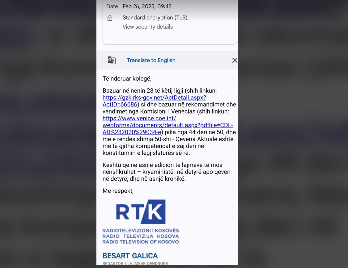 “Qeveria aktuale është me të gjitha kompetencat e saj deri në konstatimin e legjislaturës së re. Kështu që, në asnjë edicion të lajmeve të mos nënshkruhet – kryeministër në detyrë apo qeveria në detyrë, dhe në asnjë kronikë”, thuhet në email të cilin e ka siguruar gazeta Nacionale.