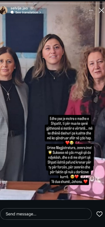 “Urime Magjistratura, zemra ime. Suksese në çdo rrugë që do ndjekësh. E di që Shpati sot buzëqesh për ty. Të dua shumë, Jehona,” përfundon urimi i Selvijes./Periskopi/