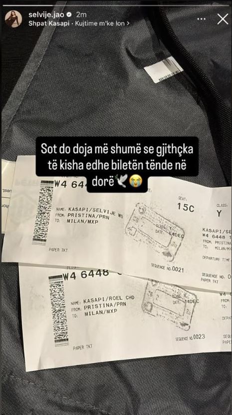 Selvije Jao, bashkëshortja e artistit të ndjerë, Shpat Kasapi përmes një InstaStory ka bërë të ditur se po niset drejt Italisë, bashkë me të birin, Roelin.