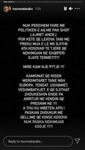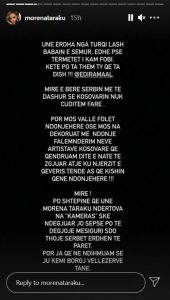 “Nuk përzihem fare me politikën e aq më pak shoh lajme andej. Por këtë që lexova tani më preku mua e le më gjithë ata kosovarë të tjerë që ndihmuan në Shqipëri gjatë tërmetit! Mirë kam një pyetje: Kamionët që nisën mërgimtarët tanë nga Evropa, tendat, ushqimet, veshmbathjet, e që gjithat zhdukeshin ende pa arritur në vendin që prisnim ne! A thua ku mbetën apo i paskan zhdukur me qëllime që kinse Kosova nuk paska ndihmuar asgjë”, ka shkruar fillimisht Morena.