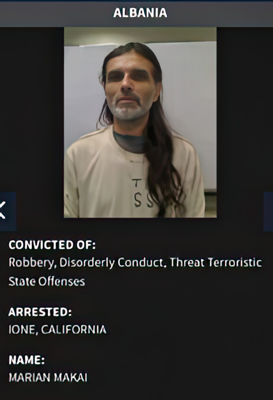 Marian Makai, i dënuar për vjedhje, sjellje të çrregullt dhe kërcënime terroriste, arrestuar në Kaliforni.
