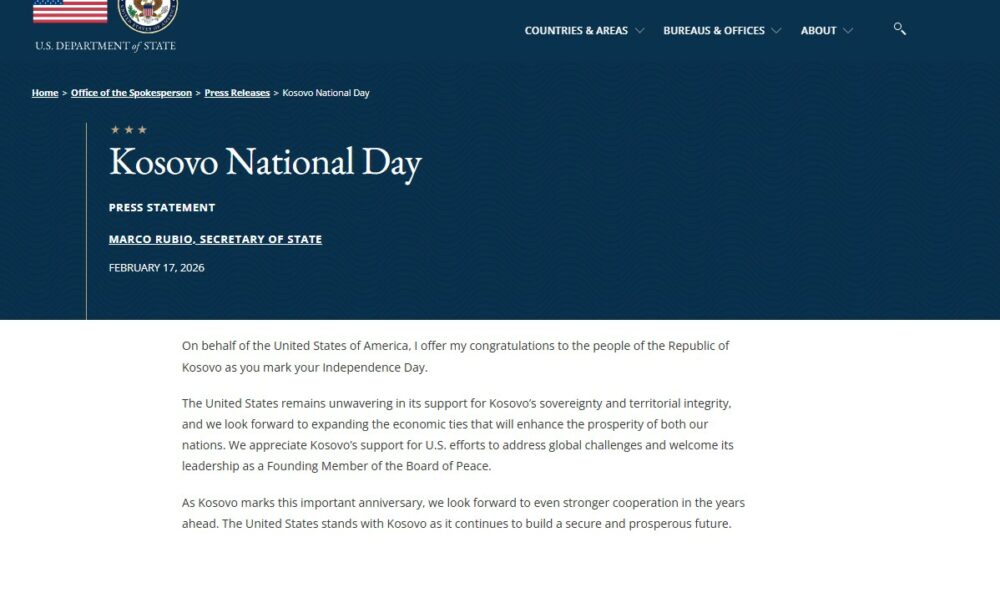 SHBA uron Kosovën për 18-vjetorin e Pavarësisë, Rubio: Mbështetje e palëkundur për sovranitet