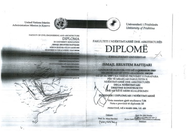 Kjo diplomë shpallet e pavlefshme për arsye administrative/ligjore dhe nuk mund të përdoret për asnjë qëllim zyrtar apo ligjor.