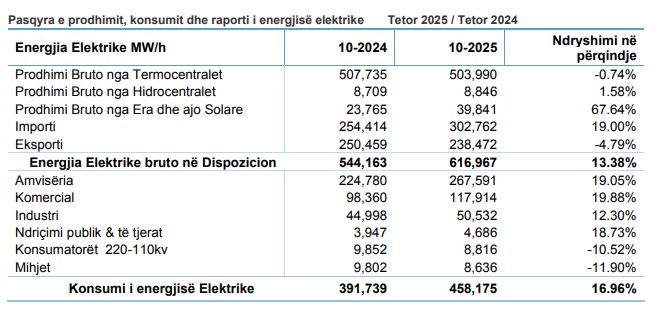 “Gjatë muajit tetor të vitit 2025 energjia elektrike bruto në dispozicion ishte 616.967 GWh kurse konsumi i energjisë elektrike ishte 458.175 GWh apo 16.96% më i madh krahasuar me muajin e njëjtë të vitit paraprak”, thuhet në komunikatën e ASK.