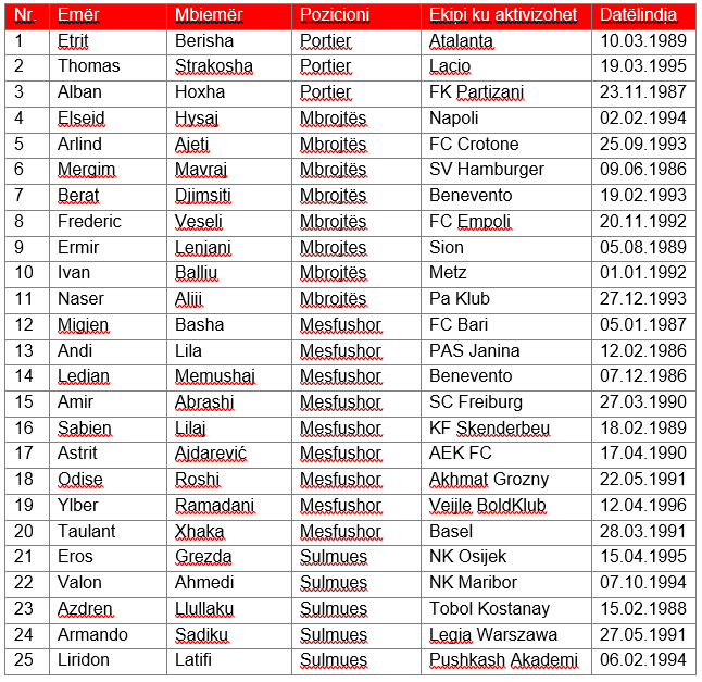 Për këtë ndeshje miqësore, mister Panuçi ka grumbulluar 25 futbollistë, ku mund të veçohen lojtarët e rinj, Astrit Ajdareviç që luan me AEK, si edhe Ylber Ramadani që luan në Danimarkë me skuadrën e Veljes.