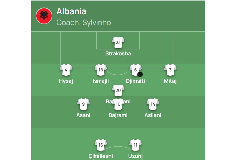 Për Shqipërinë në portë ka startuar Thoma Strakosha kurse mbrojtja përbehet nga Hysaj, Ardian Ismajli, Gjimshiti dhe Mitaj.