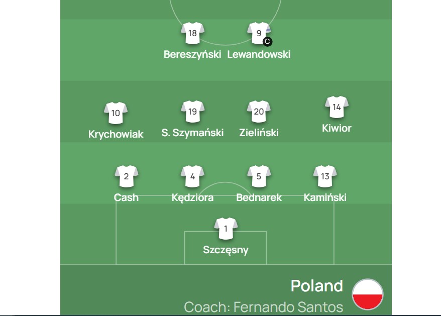 Mesfusha polake përbahet nga Krychowiak, Szymanski, Zielinski dhe Kiwior ndërkaq në sulm është Berezynski dhe Lewandowski.
